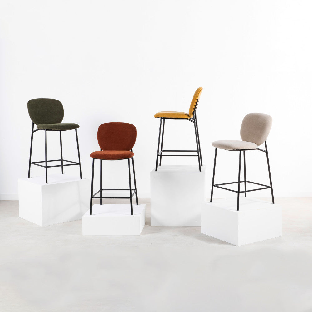 Alliant une assise en tissu doux et une structure en métal robuste, ces tabourets sont parfaits pour un îlot de cuisine ou un bar, alliant fonctionnalité et style.