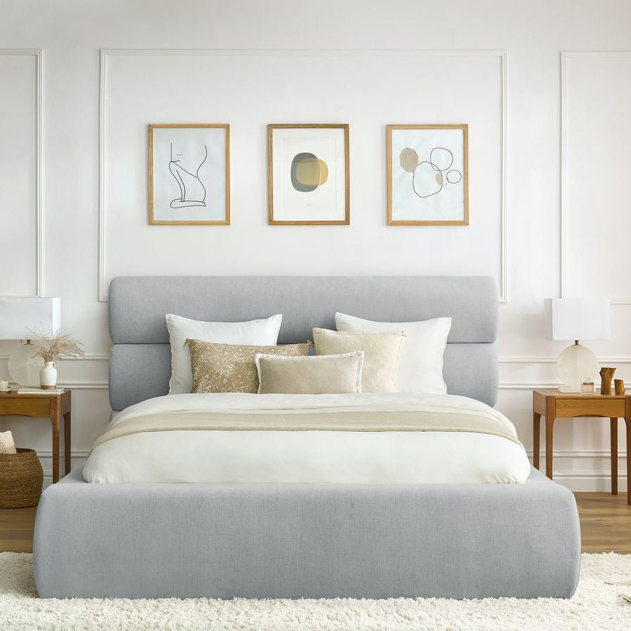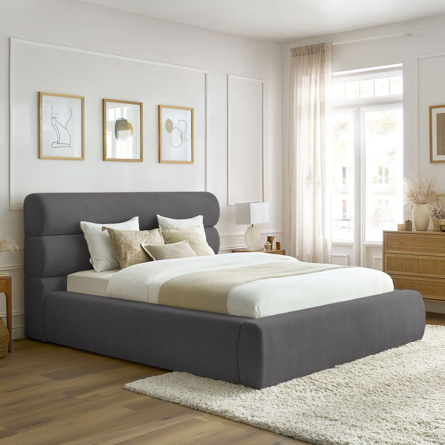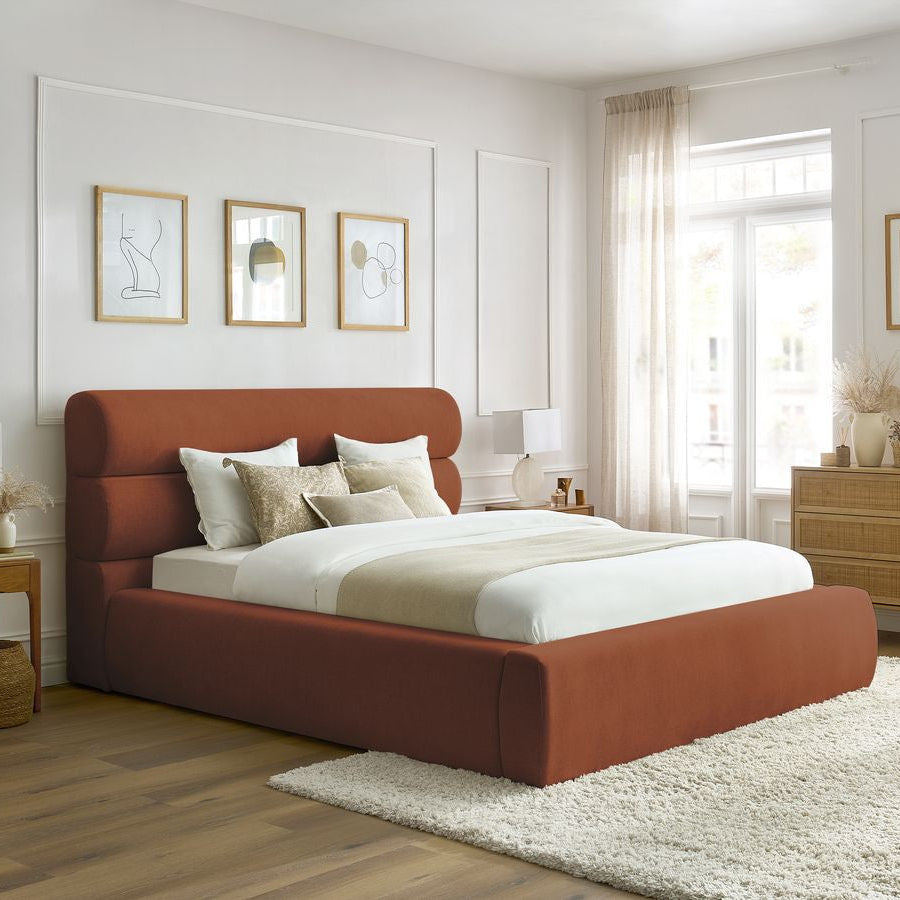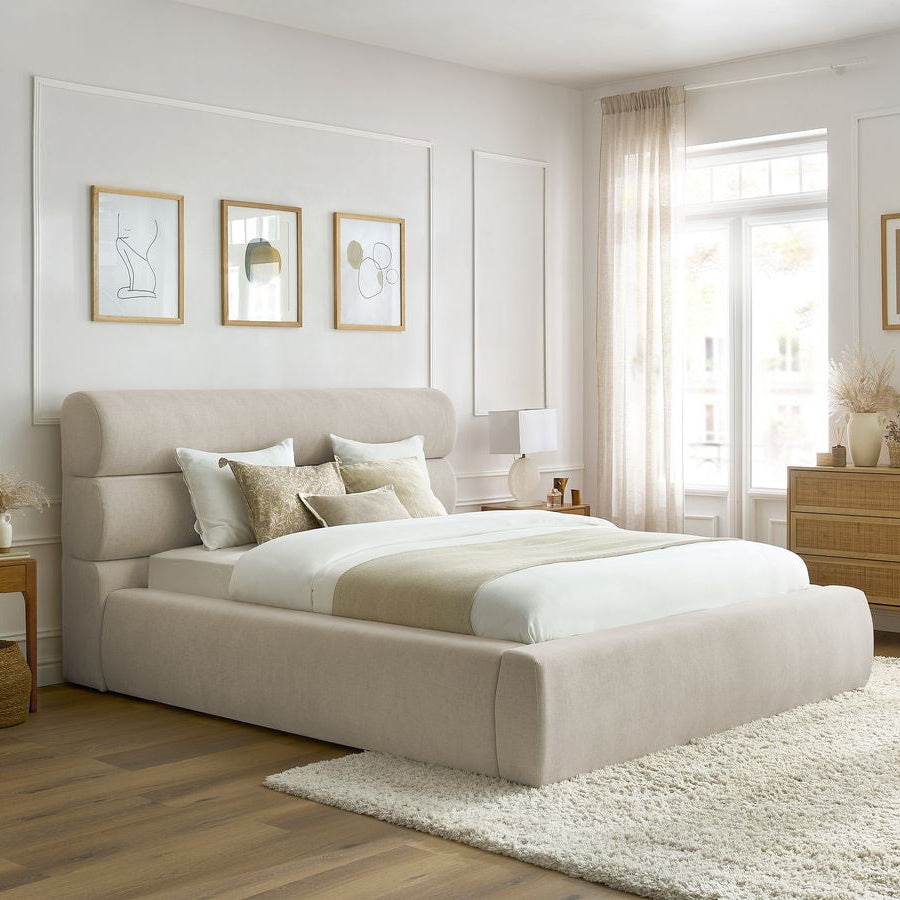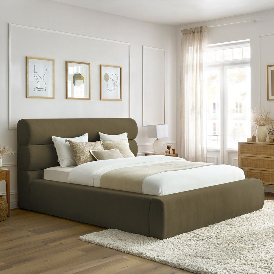 Son revêtement en tissu doux et sa tête de lit capitonnée créent une ambiance apaisante et raffinée. Grâce à son coffre de rangement intégré, ce lit allie esthétique et praticité au quotidien.