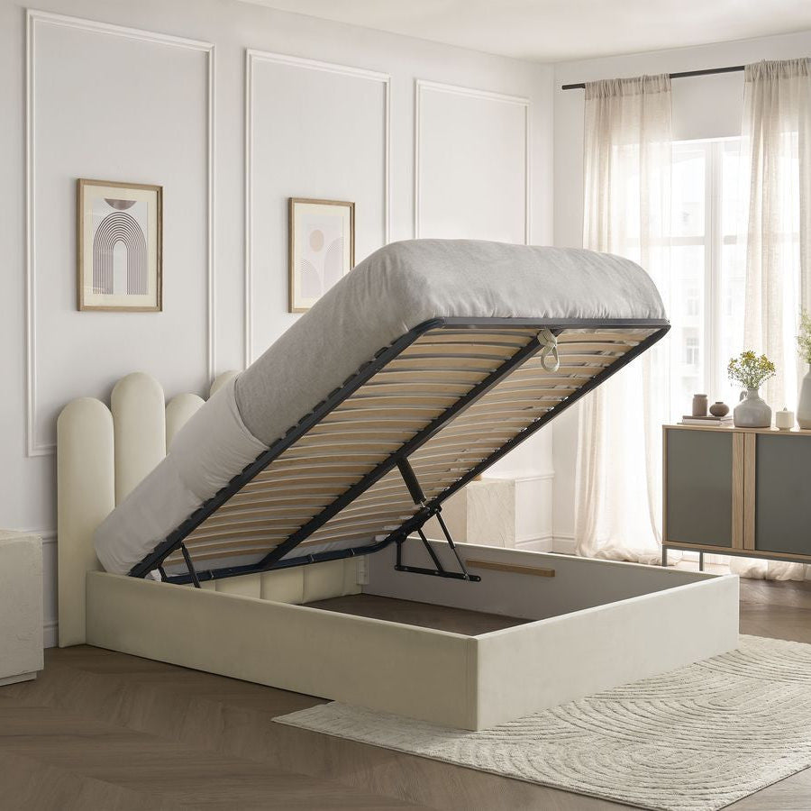 Laissez-vous séduire par le lit coffre BADJA, une pièce maîtresse au design arrondi et raffiné.