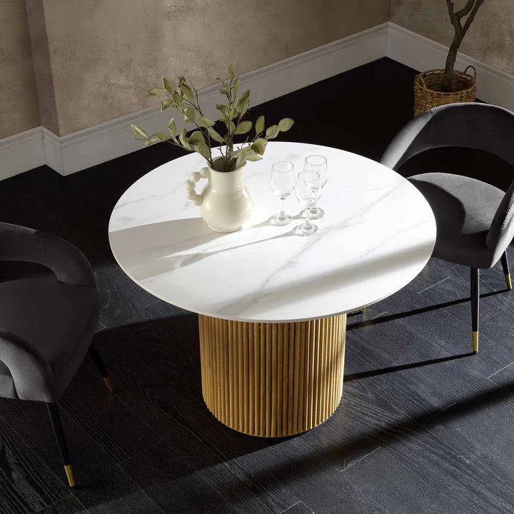 Apportez une touche moderne et élégante à votre salle à manger avec la table Maru, disponible en trois dimensions pour s’adapter à votre espace : 120 cm, 100 cm, et 90 cm de diamètre.