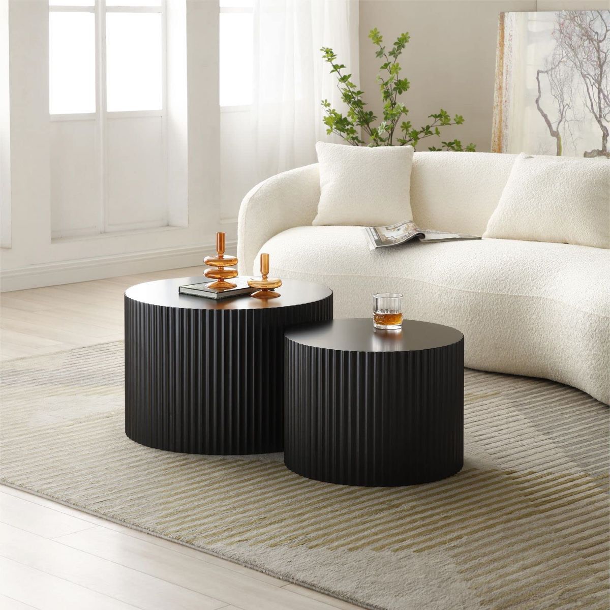 Cette table basse est haute, avec une base en bois MDF recouverte et un plateau circulaire en bois MDF